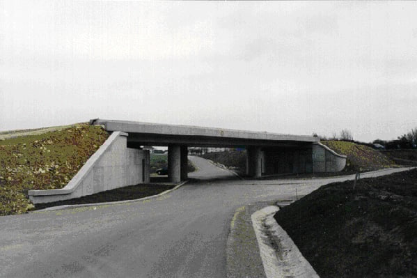 Vier Eisenbahnbrücken, eine Straßenbrücke und ein 200 m langer Grüntunnel waren im Zuge der Neuerrichtung der zweigleisigen Hochleistungsstrecke im Baulos Loosdorf zu planen. Das Bild zeigt die Querung eines Wirtschaftsweges in einem ungünstigen schleifenden Schnitt, die durch eine dreifeldrige Brücke mit versetzten Widerlagern gelöst wurde.