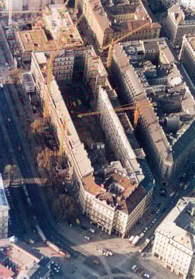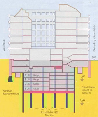 Es erfolgte eine Entkernung des gesamten Komplexes, wobei innerhalb der ersten Mittelmauer mit Hilfe der Deckelbauweise und gefrästen Schlitzwänden 6 Tiefgeschosse mit einer maximalen Aushubtiefe