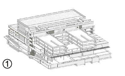 auch geschossweise wechselnden Raster erfordern verschiedenartige Abfangekonstruktionen zur Aufnahme der Stützlasten.