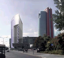 Elementfassade im Millimeterbereich hinzu. Ab dem 3.OG ragt der Turmspitz etwa 10 m aus, konstruktiv gelöst durch eine dreigeschossige über die Decken bis zum Kern vorgespannte Stahlbetonkonsole.