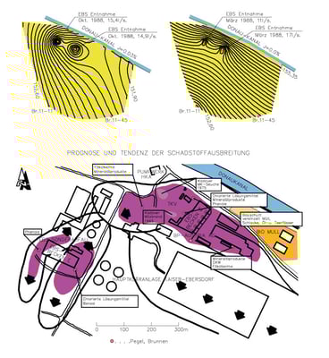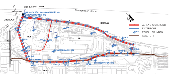 Die Sicherung der Betriebsstandorte erfolgte mittels Umschließung nach dem Wiener Dichtwandkammersystem. Die Dichtwände wurden mittels Schmalwandverfahren hergestellt und binden mit einer Tiefe bis 33 m unter Gelände in den Grundwasserstauer ein. Gleichzeitig mit der Altlastsicherung wurde der Kaiserebersdorfer Sammelkanal – Entlastungskanal errichtet und verläuft zwischen den Dichtwänden der südlichen Kammern. Bei der Wasserfassung aus den Dichtwandkammern wurden neue Wege beschritten. Mittels horizontalen Filterrohr DN 300mm wurden mehrere Dichtwandkammern bis auf eine Länge von 600 m hydraulisch verbunden.